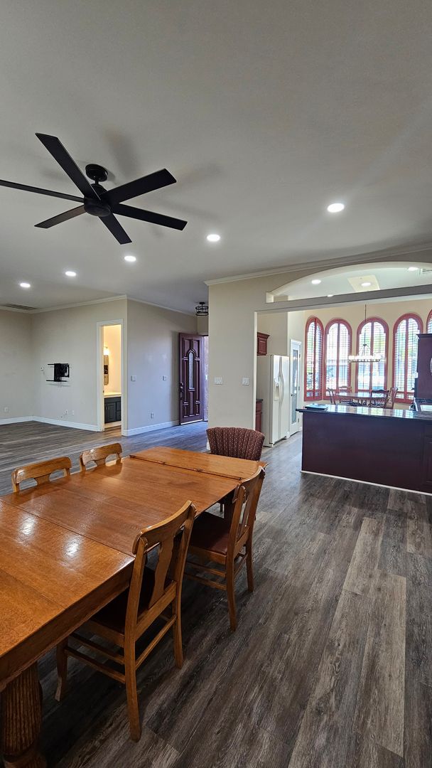 Step inside to discover high ceilings, recessed lighting, and ceiling fans throughout the home, creating a bright and comfortable atmosphere. The layout features a formal dining area perfect for hosting gatherings as well as a sun-filled breakfast nook surrounded by gorgeous arched windows that fill the space with natural light.
